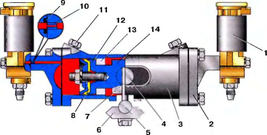 I - электропневматический вентиль; 2 - крышка цилиндра; 3 - цилиндр; 4 - сухарь; 5 - кулачковый вал реверсивно-тормозного переключателя; 6 - упор; 7 - поводок; 8 - резиновая манжета; 9 - уплотнительное кольцо; 10 - втулка; 11 - резьбовая пробка; 12 - поршень; 13 - войлочное кольцо; 14 - шток
