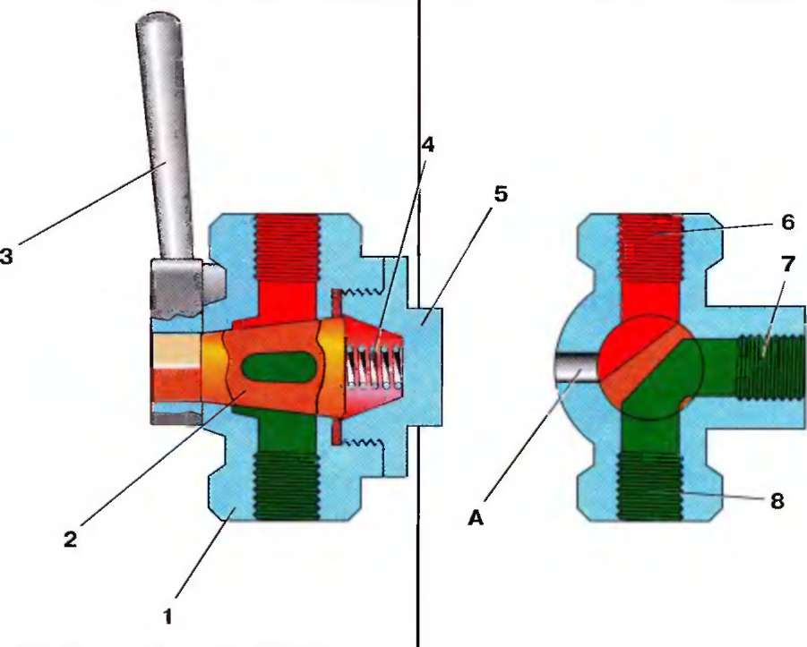 1 - корпус; 2, 5 - пробка; 3 - ручка; 4 - пружина; 6, 7, 8 - штуцер; А - атмосферное отверстие