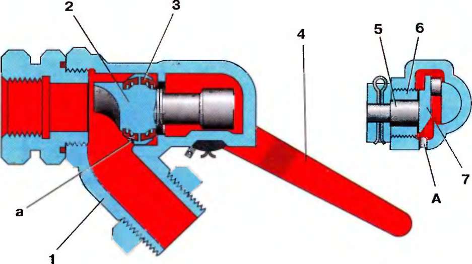 1 - корпус; 2 - клапан; 3 - уплотнительное кольцо; 4 - ручка; 5 - эксцентриковый кулачок: 6 - гайка; 7 - палец клапана; А - атмосферное отверстие; а - отверстие диаметром 2,5 мм
