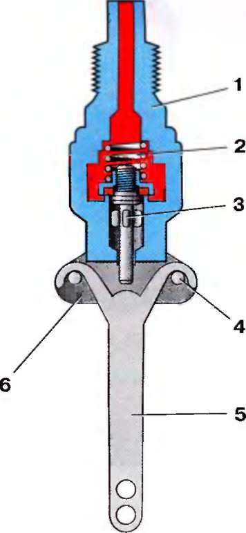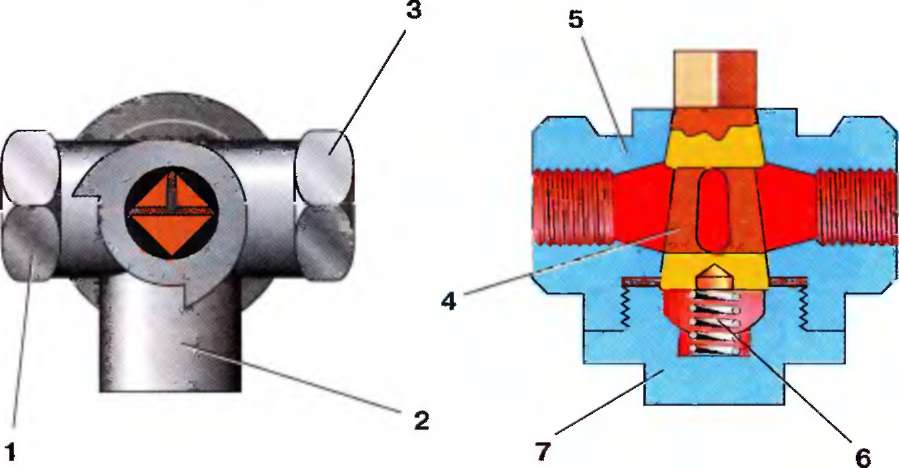 I - седло; 2 - клапан; 3 - корпус; 4 - пружина; 5 - колпачок; 6 - регулировочная пробка: 7 - упор пружины