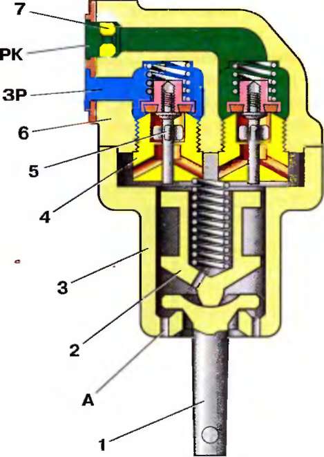 1 - ручка; 2 - толкатель; 3 - стакан; 4 - седло клапана; 5 - клапан; 6 - корпус; 7 - ниппель; А - -атмосферное отверстие