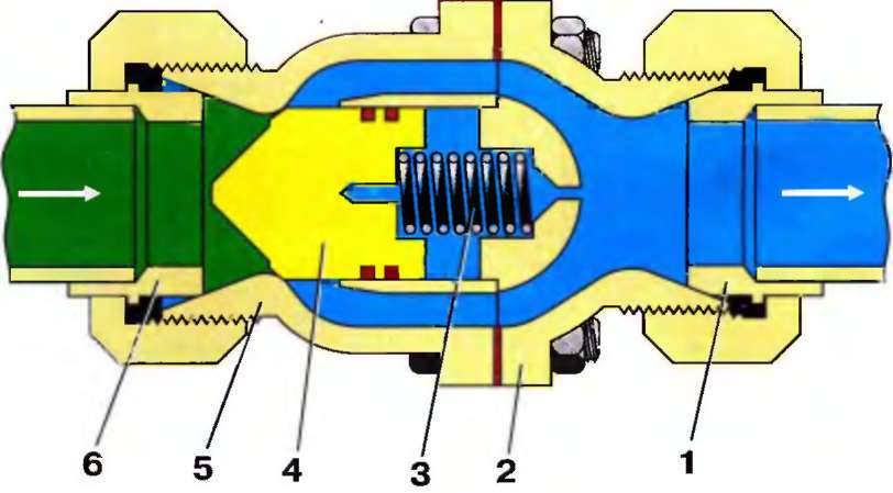 1 - наконечник со стороны главного резервуара; 2 - крышка; 3 - пружина; 4 - клапан; 5 - корпус; 6 - наконечник со стороны компрессора