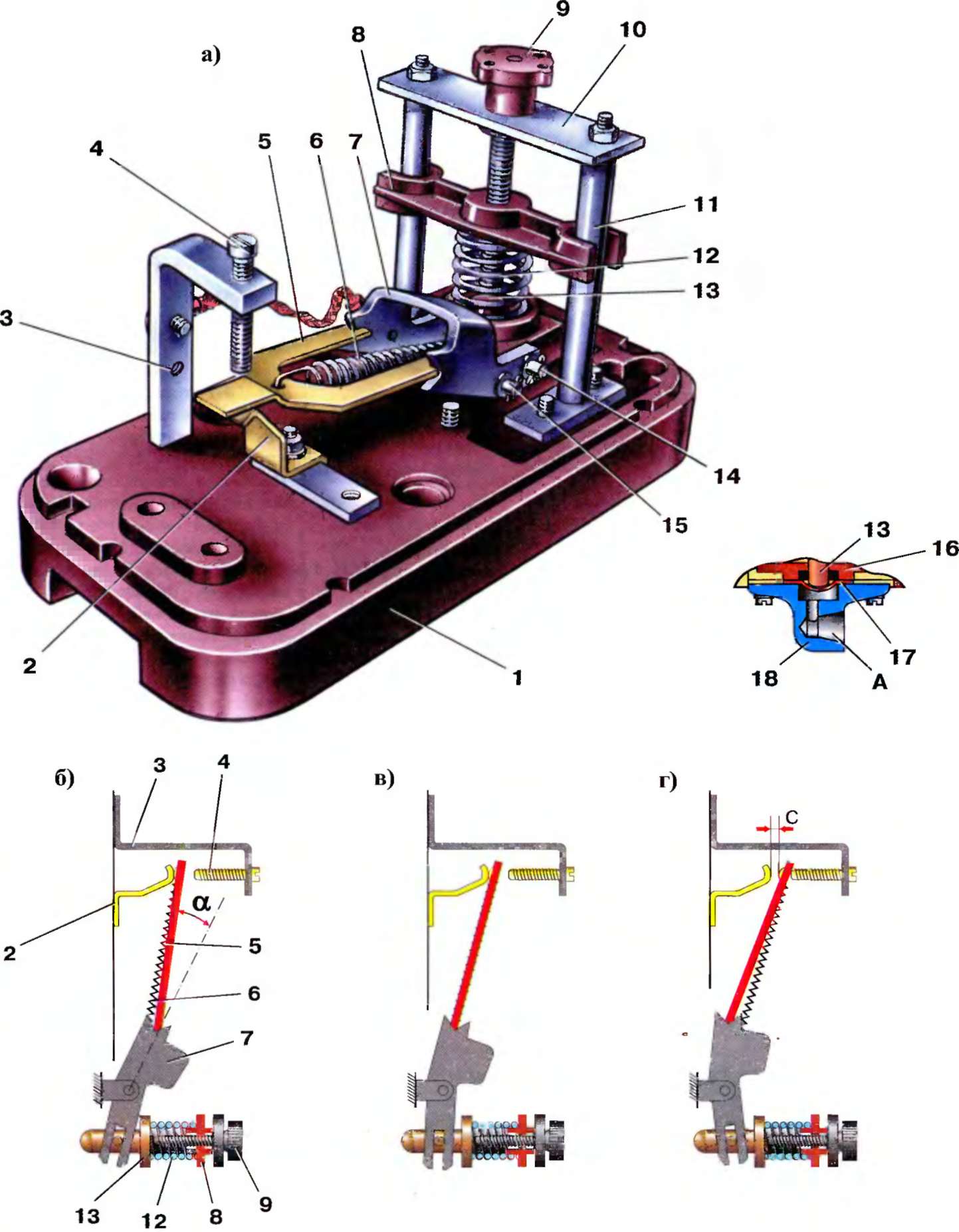 На основании укреплены: стойка 3 с винтом 4 для регулировки зазора между контактами, неподвижный контакт 2, две стойки 11, соединенные металлической планкой 10, и пластмассовая направляющая 16. В пластмассовом штоке 13, упирающемся в диафрагму 17,