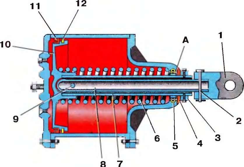 В горловине передней крышки 4 расположен сетчатый фильтр 3, закрывающий отверстия А. Резиновая шайба 2 защищает полость горловины крышки от пыли. Упорное кольцо 1 позволяет снимать крышку вместе со штоком, поршнем и пружиной 7.