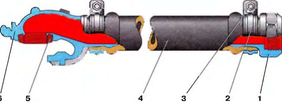 I - наконечник; 2 - хомут; 3 - болт хомута; 4 - резинотканевая трубка; 5 - уплотнительное кольцо; 6 - головка