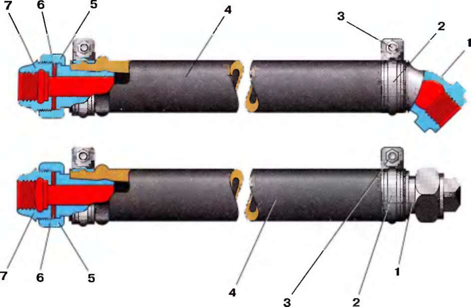 Наконечники 1 с соединительными гайками 5 и штуцерами 7 укреплены в резинотканевых трубках 4 тем же способом, что и у рукава усл. № Р17, т.е. при помощи хомутов 2 с болтами 3.