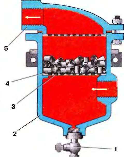 1 - выпускной кран; 2 - корпус; 3 - решетка; 4 - обрезки металлических трубок; 5 - крышка