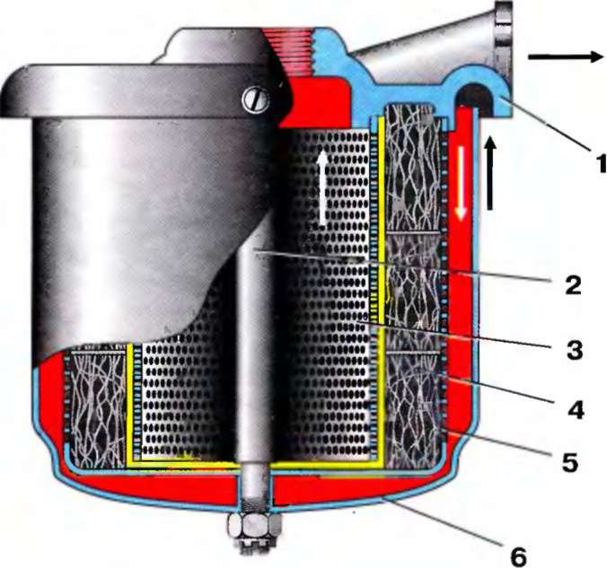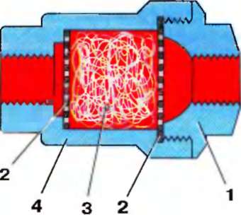 Он состоит из корпуса 4, фильтрующей набивки 3 из конского волоса и крышки 1. Набивку слегка промасливают и закладываюет между сетчатыми шайбами 2.
