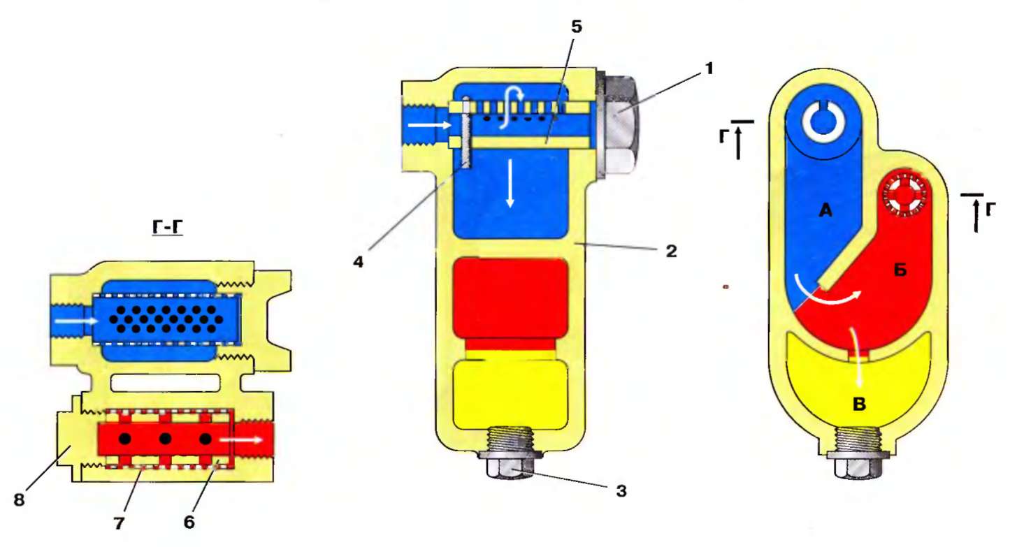 Фильтр-сборник (рис. 7.43) состоит из корпуса 2, заглушки (пробки) 1, фильтрующего патрона 5 со шпилькой 4, цилиндра 6 с двенадцатью радиальными отверстиями, сетки 7 и пробок 3 и 8.