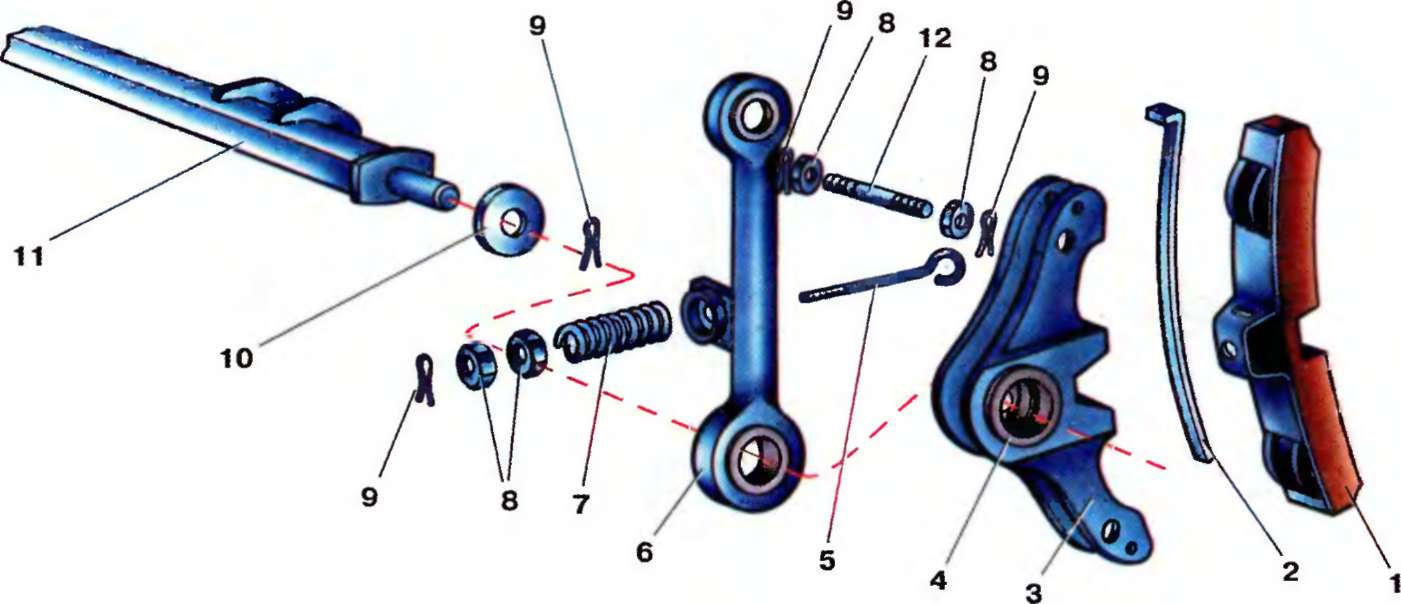 1 - тормозная колодка; 2 - чека; 3 - башмак; 4 - втулка; 5 - поводок; 6 - подвеска башмака; 7 - пружина; 8 - гайка; 9 - шплинт; 10 - шайба; 11 - триангель; 12 - палец поводка