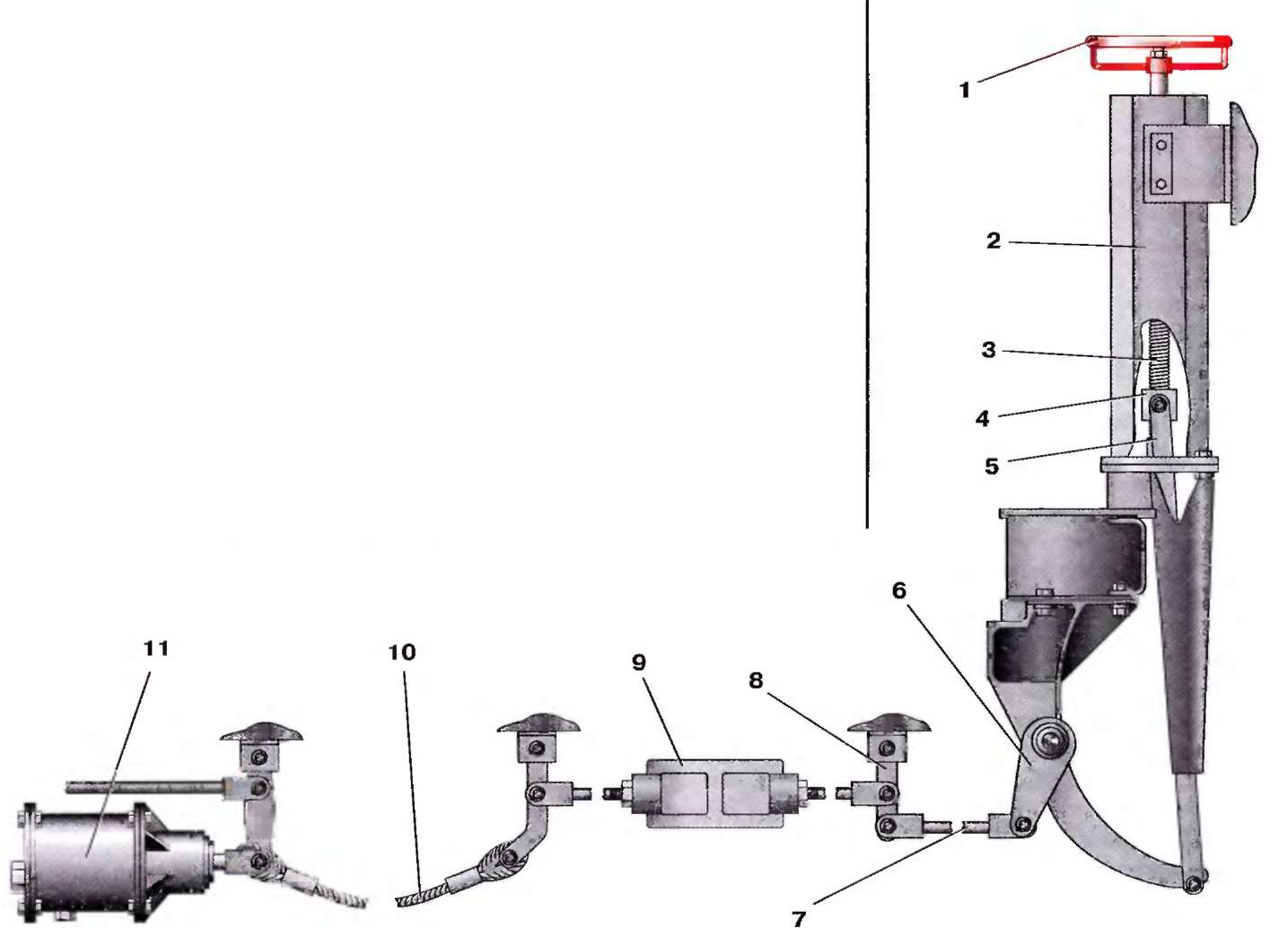 I - маховик; 2 - колонка; 3 - тормозной винт; 4 - гайка; 5,8- вертикальные тяги; 6 - коленчатый вал; 7 - горизонтальная тяга; 9 - регулировочный узел; 10 - трос;