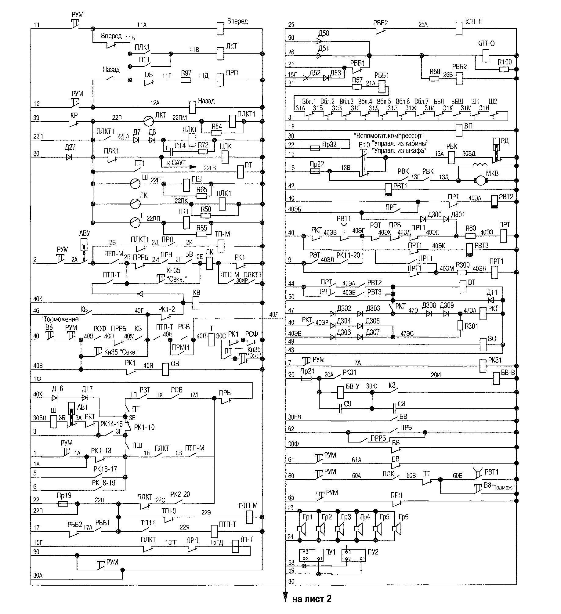 Между проводом 40Р и катушкой СК (до перемычки), не нарисована нормально-замкнутая блокировка РКТ Схема принципиальная моторного вагона (лист 2):