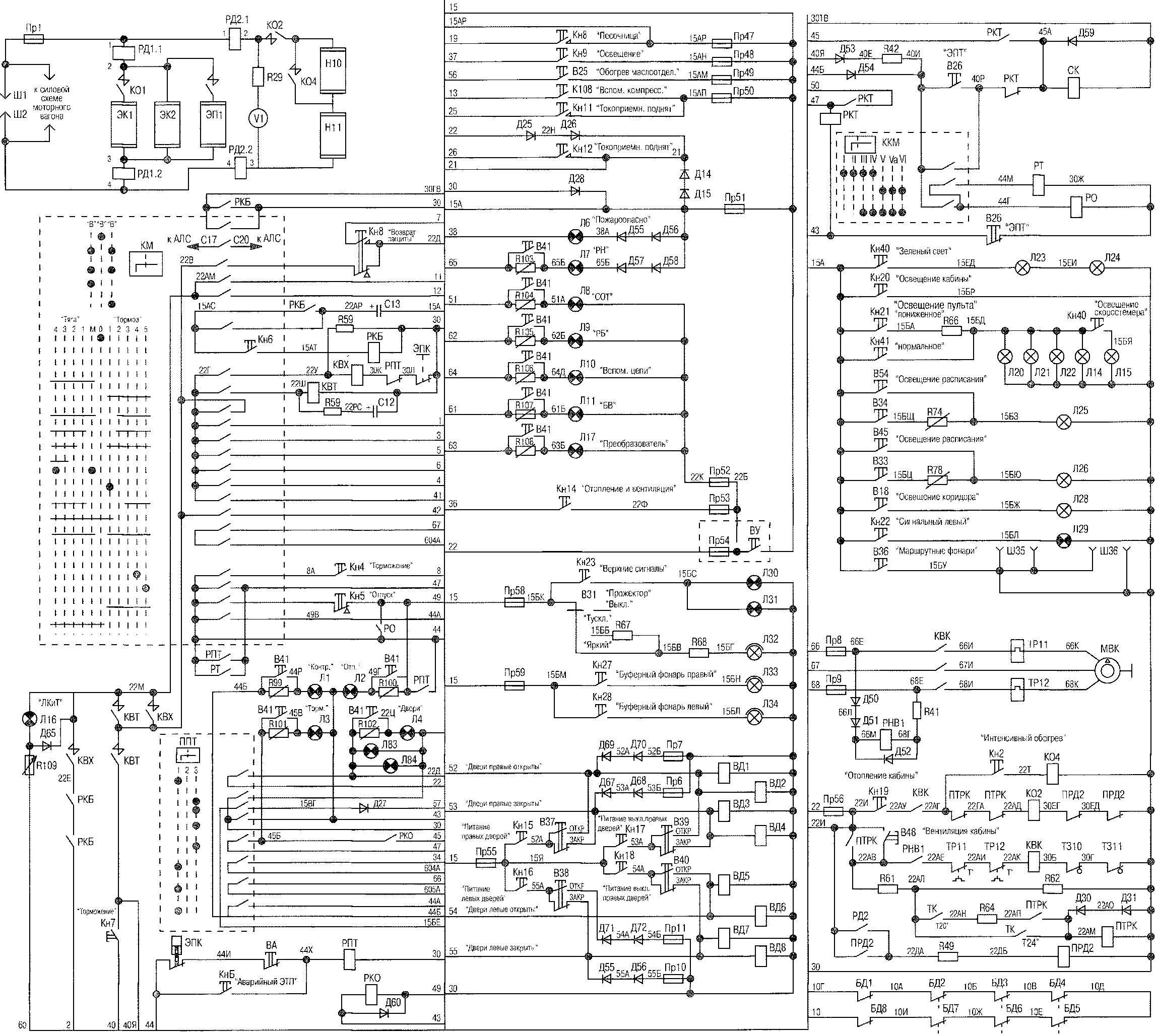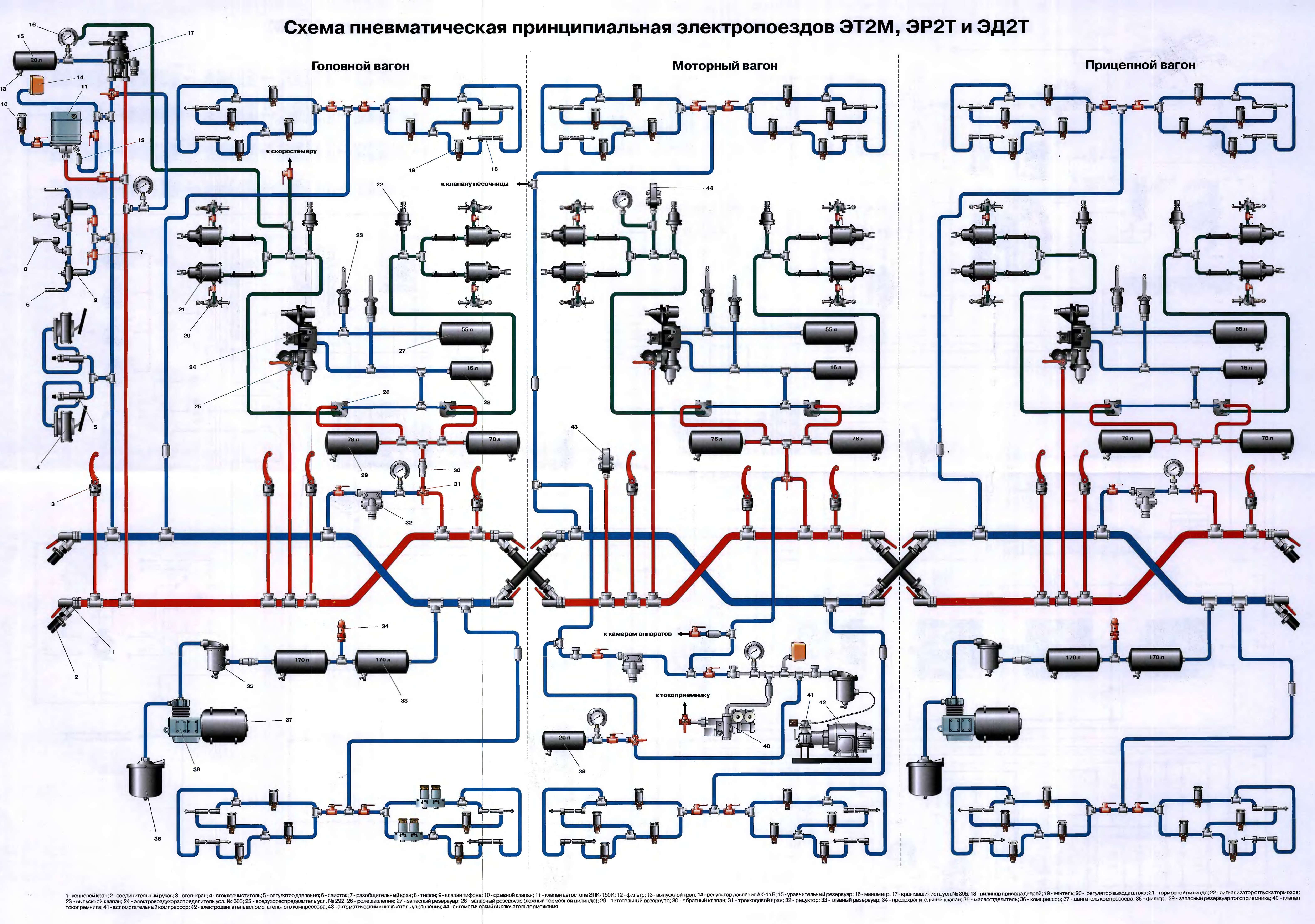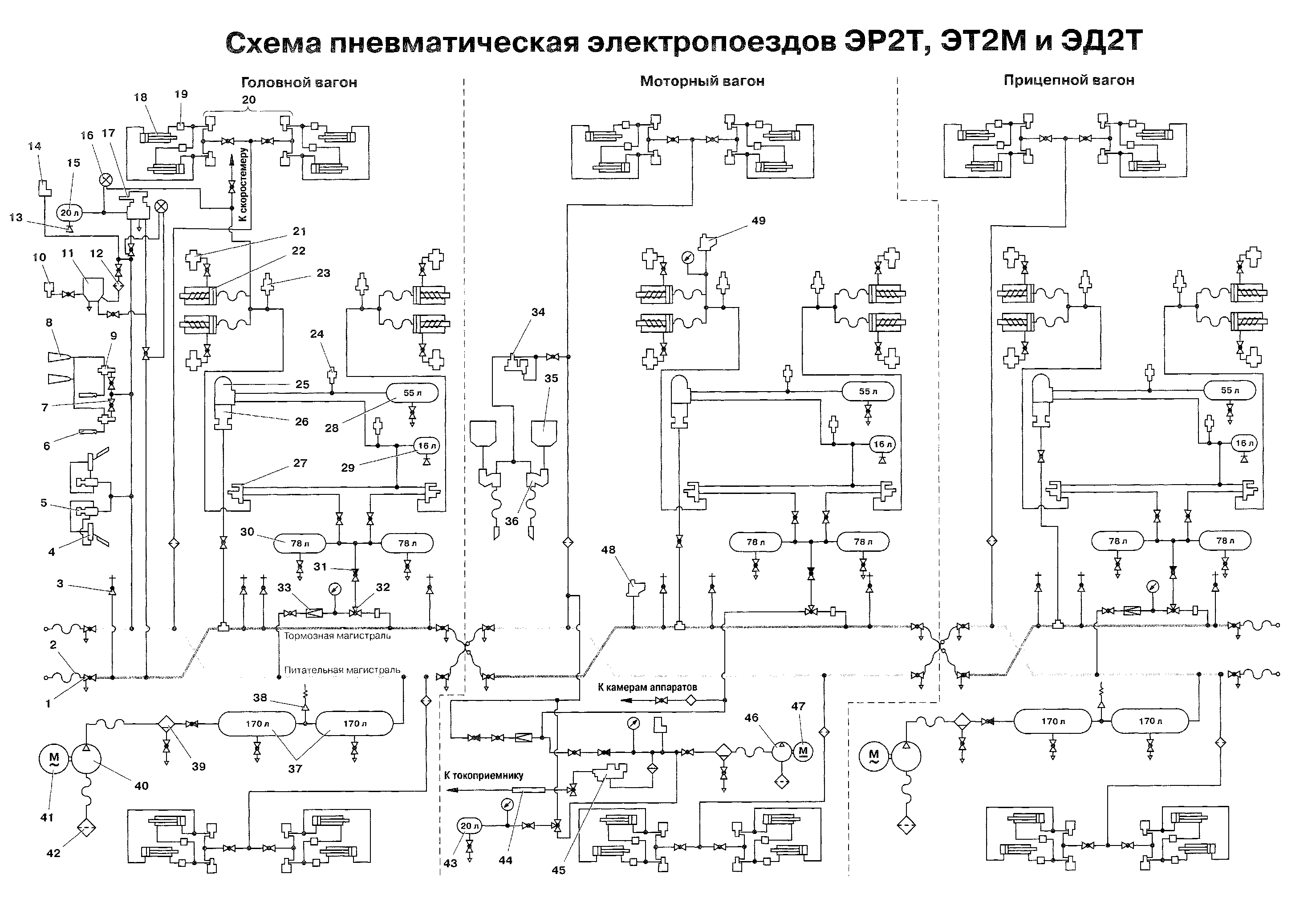 1 - концевой кран; 2 - соединительный рукав; 3 - стоп-кран; 4 - стеклоочиститель; 5 - регулятор давления; 6 - свисток; 7 - разобщительный кран; 8 - тифон; 9 - клапан тифона; 10 - срывной клапан; 11 - клапан автостопа ЭПК-150И; 12 - фильтр; 13 - выпускной кран; 14 - регулятор давления АК-11 Б; 15 - уравнительный резервуар; 16- манометр; 17- кран машиниста усл. №395; 18 - цилиндр привода дверей; 19 - вентель; 20 - пневматическое устройство УПН-5; 21 - регулятор выхода штока; 22 - тормозной цилиндр; 23 -сигнализатор отпуска тормозов; 24 - выпускной клапан; 25 - электровоздухораспределитель усл. № 305; 26 - воздухораспределитель усл. № 292; 27 - реле давления; 28 - запасный резервуар; 29 - запасный резервуар (ложный тормозной цилиндр); 30 -питательный резервуар; 31 - обратный клапан; 32 - трехходовой кран; 33 - редуктор; 34 - клапан песочницы; 35 - бункер песочницы; 36 - форсунки песочницы; 37 - главный резервуар; 38 - предохранительный клапан; 39 - маслоотделитель; 40 - компрессор; 41 -двигатель компрессора; 42 - фильтр; 43 - запасный резервуар токоприемника; 44 - соединительный рукав; 45 - клапан токопремника; 46 - вспомогательный компрессор; 47 - электродвигатель вспомогательного компрессора; 48 - автоматический выключатель управления; 49 - автоматический выключатель торможения