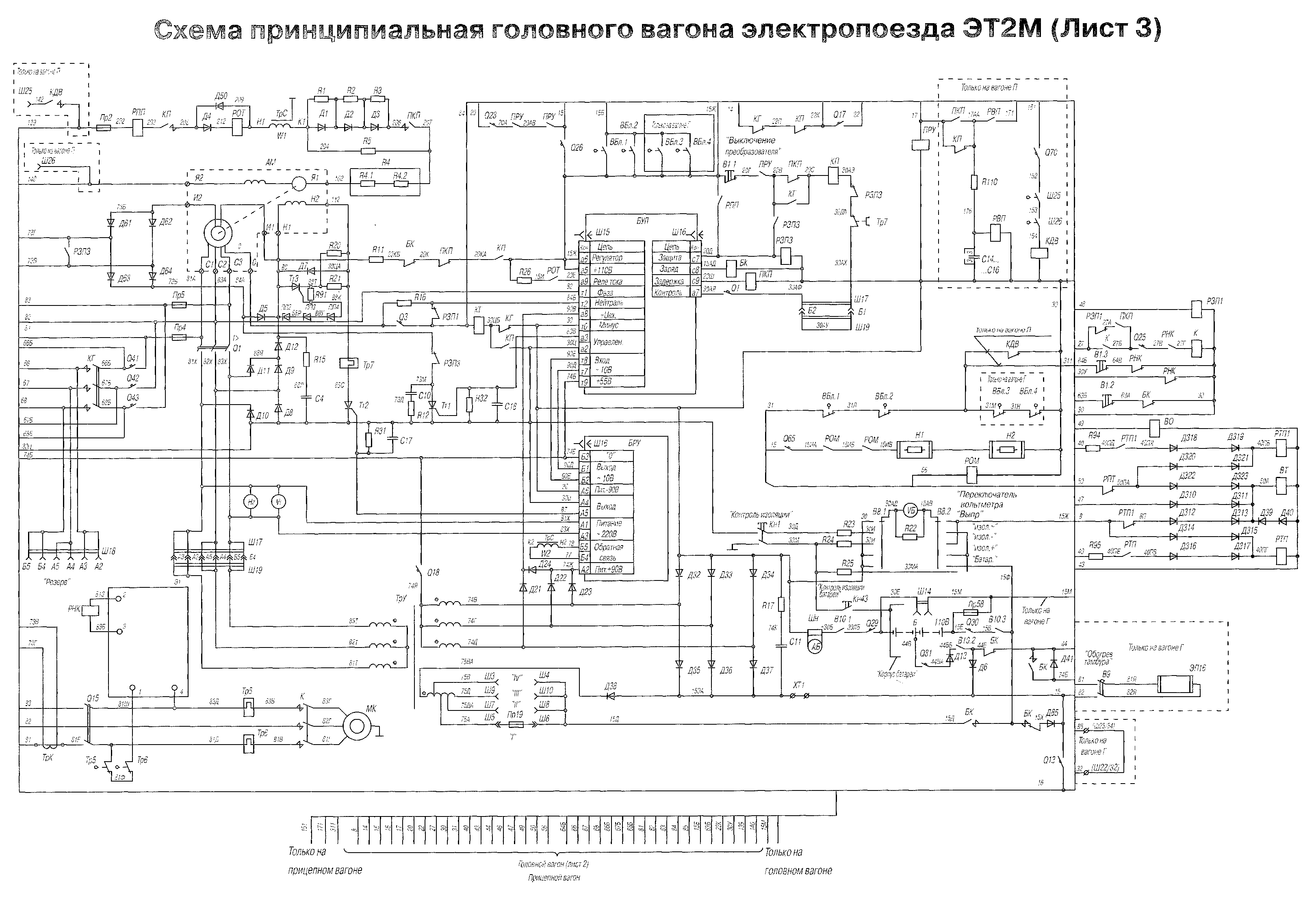 Схема принципиальная головного вагона (лист 2), убрать слова «Стеклообогрев внутренний и наружный». Диод Д46 в проводе 64, развернуть в обратную сторону. Схемы ЭТ2М: