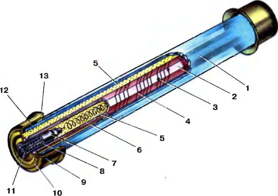 I - патрон; 2 - сердечник; 3 - оловянные шарики; 4 - плавкая вставка; 5 - наполнитель (кварцевый песок); 6 ■ указательная проволока; 7 - текстолитовая шайба; 8 - пружина указателя срабатывания; 9 - колпачок; 10 крышка колпачка; 11 - указатель срабатывания: 12 - асбоцементная прокладка: 13 - цементная заливка