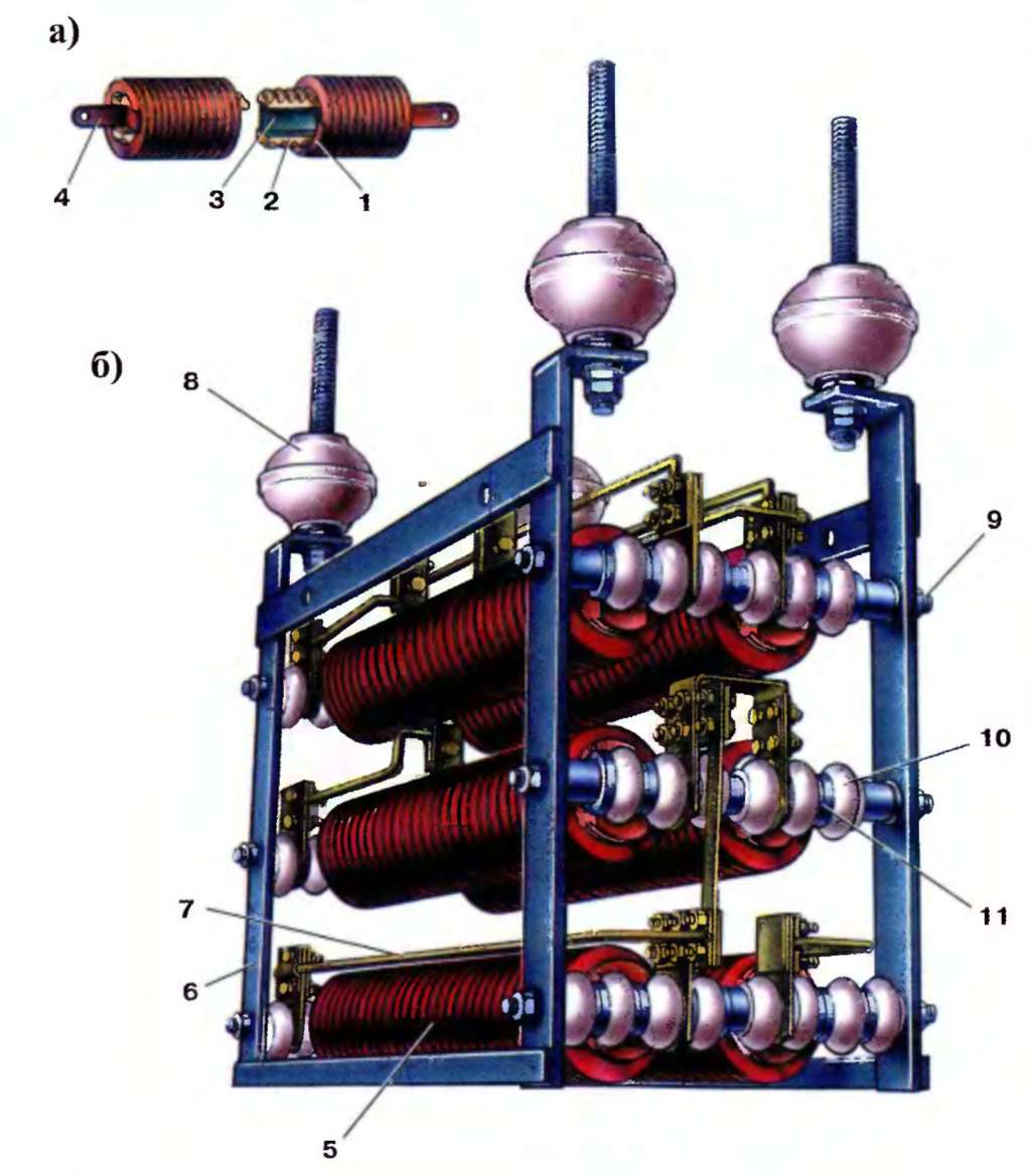 а - резисторный элемент КФ; б - резистор РТ-45; 1 - резисторный элемент (спираль); 2 - изолятор; 3 - держатель; 4 - вывод; 5 - резисторный элемент КФ в сборе; 6 - стойка; 7 - соединительная шина; 8 - изолятор подвески резистора; 9 - держатель; 10 - изолятор держателя; 11 - изоляционная втулка