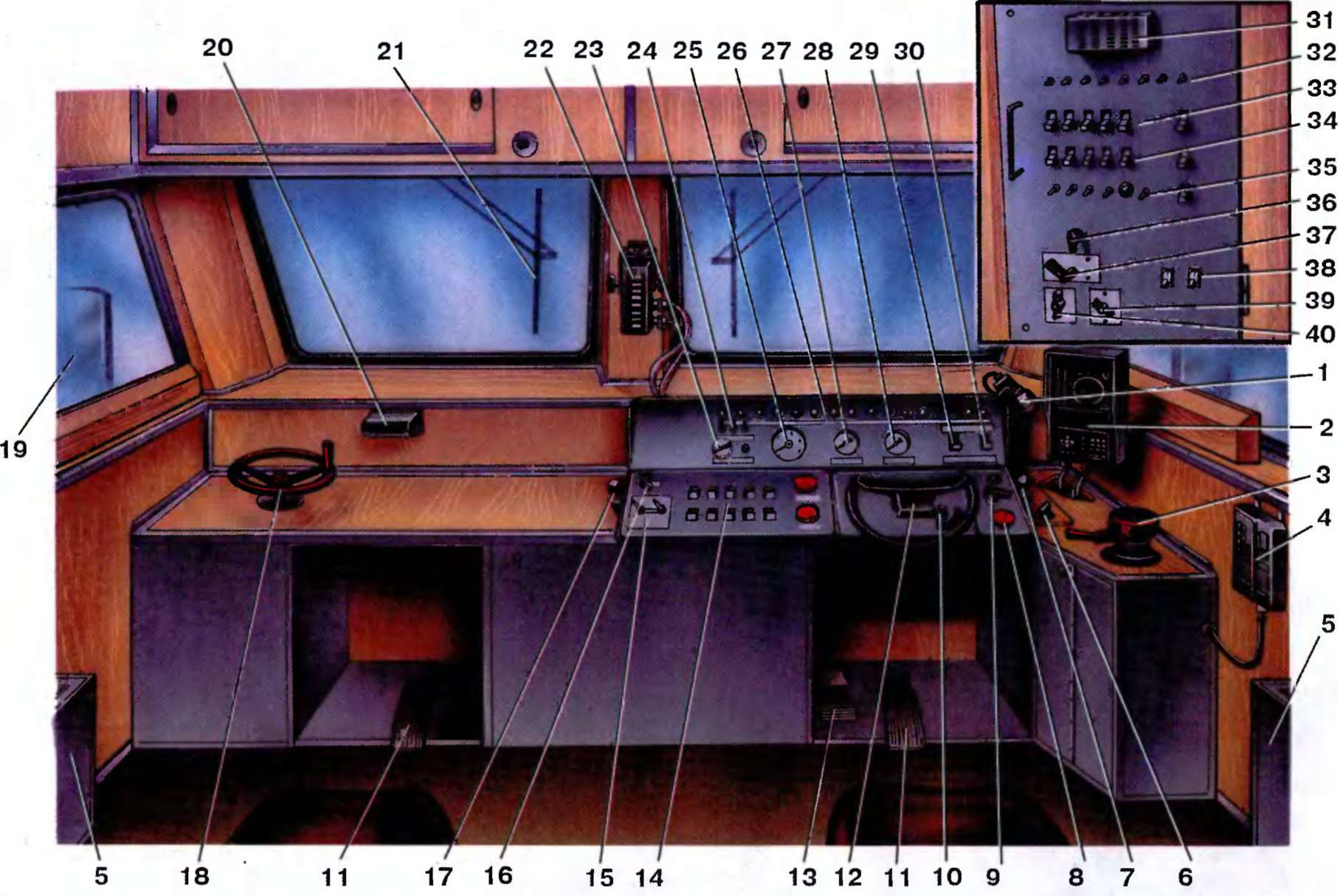 I - лампа подсветки расписания машиниста; 2 - БИЛ-В; 3 - кран машиниста; 4 - радиостанция; 5 - электрообогреватель; 6 - регулятор ускорения; 7 - кнопка РБ; 8 - звонок; 9 - выключатель прожектора; 10 - хвостовик реверсивного барабана; 11 - педаль управления свистком и тифоном; 12 - контроллер машиниста; 13 - педаль контроля бдительности машиниста; 14 - блок переключателей панели управления; 15 - блок управления автоматическими дверями 1-го тамбура головного вагона (при модернизации); 16 - переключатели освещения пульта управления; 17 - кнопка РБП; 1 8 - штурвал ручного тормоза; 19 - зеркало заднего вида: 20 - плафон подсветки расписания помошника машиниста: 21 - щетки стеклоочистителя; 22 - светофор автоматической локомотивной сигнализации; 23 - переключатель освещения расписания; 24 - переключатели освещения сигнальных ламп; 25 - кило-вольтметр; 26 - блок сигнальных ламп; 27 - манометр напорной и тормозной магистрали; 28 - манометр тормозного цилиндра и уравнительного резервуара; 29 - выключатель левых дверей; 30 - выключатель правых дверей; 31 - блок автоматического контроля климата в кабине машиниста; 32 - блок переключателей вентиляции н освещения кабины, хвостовых сигнальных огней, буферных фонарей и маршрутных указателей; 33 - блок переключателей вентиляции и отопления вагонов, обогрева боковых и лобовых стекол кабины машиниста, отопления кабины; 34 - блок переключателей питания автоматических дверей, вспомогательного компрессора и ВА; 35 - блок переключателей освещения вагонов, дежурного освещения, радиостанции, ЭПТ, звонка, ВК, ВУ; 36 - переключатель режимов электрообогрева лобовых стекол; 37 - переключатель ППТ; 38 - выключатель КЛУБ-У; 39 - выключатель дополнительного обогрева кабины; 40 - выключатель обогрева влагомаслоотделителей