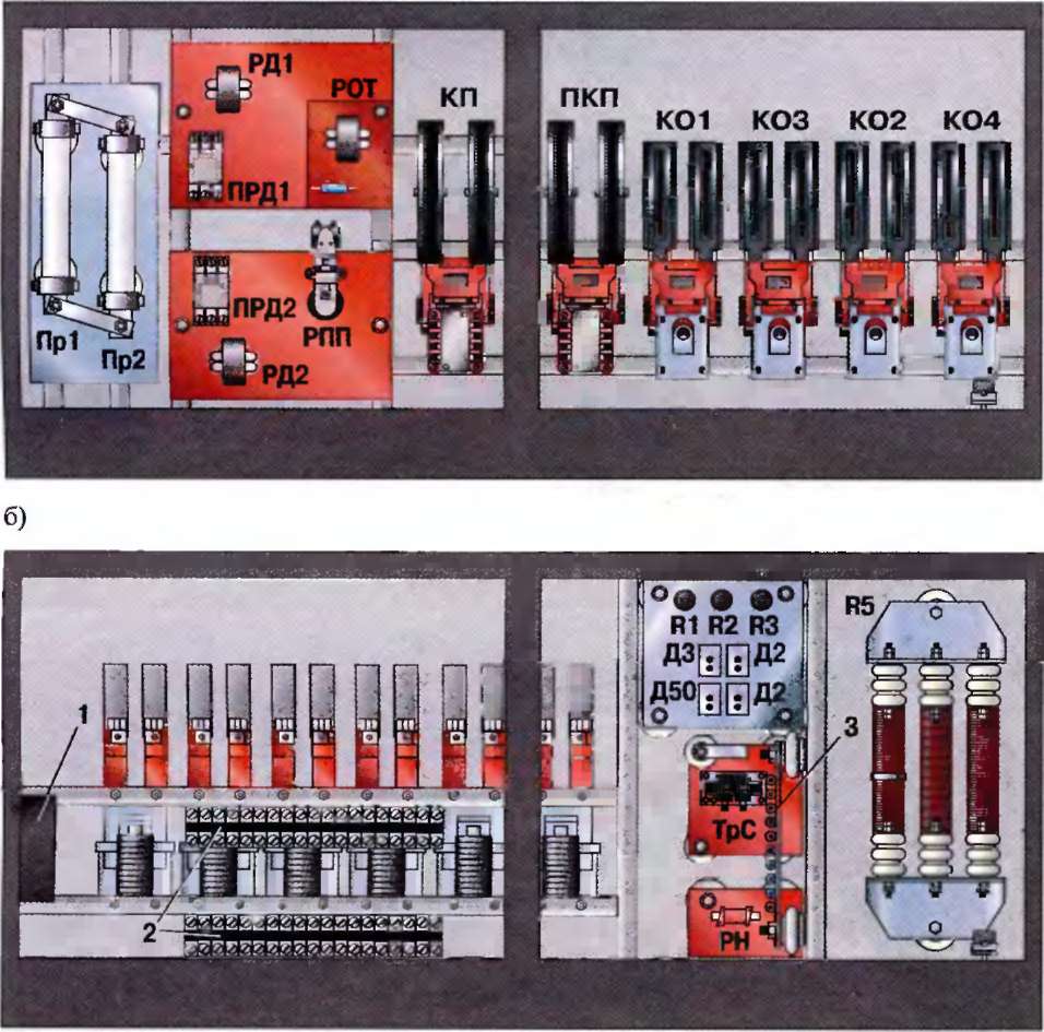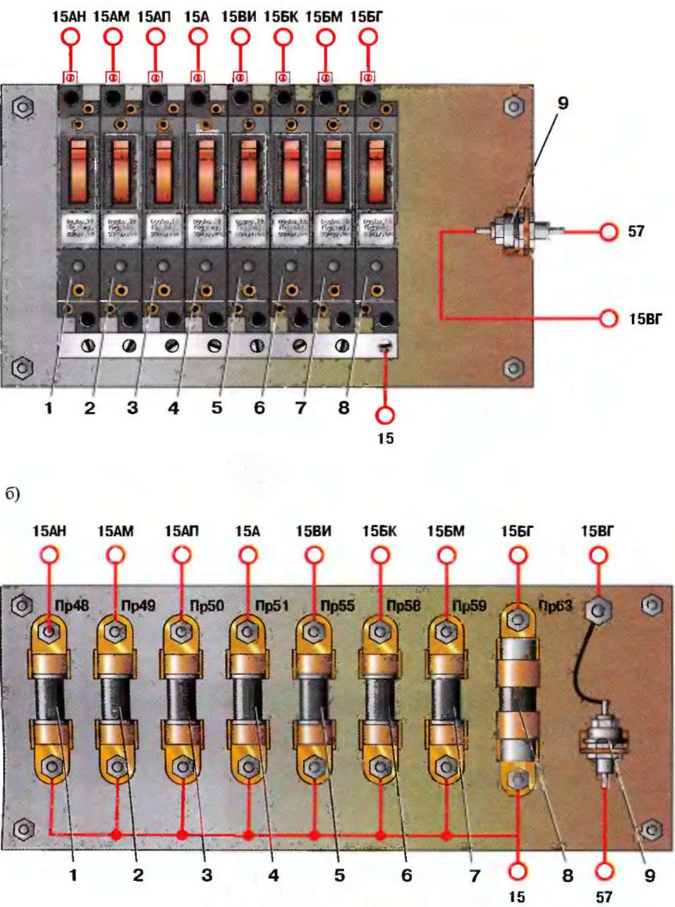 а - автоматы защиты электропоезда ЭТ2М; б - предохранители электропоезда ЭР2Т; 1- защша цепи главного освещения;