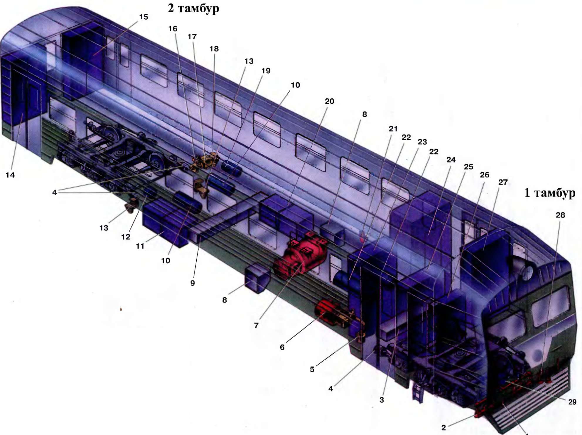 I - свнсток; 2 - приемная катушка АЛСН; 3 - сливной бак туалета; 4 - тормозной цилиндр: 5 - фильтр компрессора; 6 - компрессор: 7 - преобразователь; 8 - фильтр преобразователя; 9 - ящнк для инструмента; 10 - воздушный резервуар управления объемом 78 л; И - ящик с аккумуляторной батареей; 12 - воздушный резервуар объемом 16 л; 13 - реле давления; 14 -шкаф №6; 15- шкаф № 7; 16 - воздухораспределитель усл. № 292; 17 - рабочая камера воздухораспределителя; 18 - электровоздухораспределитель усл. № 305; 19 - воздушный резервуар объемом 55 л; 20 - ящик с контакторами высоковольтных вспомогательных цепей; 21 - розетка электропитания от сети депо: 22 - воздушный резервуар объемом 170 л; 23 - шкаф № 5; 24 - туалет; 25 - шкаф № 2; 26 - шкаф № 1; 27 - шкафы № 3 и № 4; 28 - тн-фон; 29 - воздушный резервуар объемом 20 л