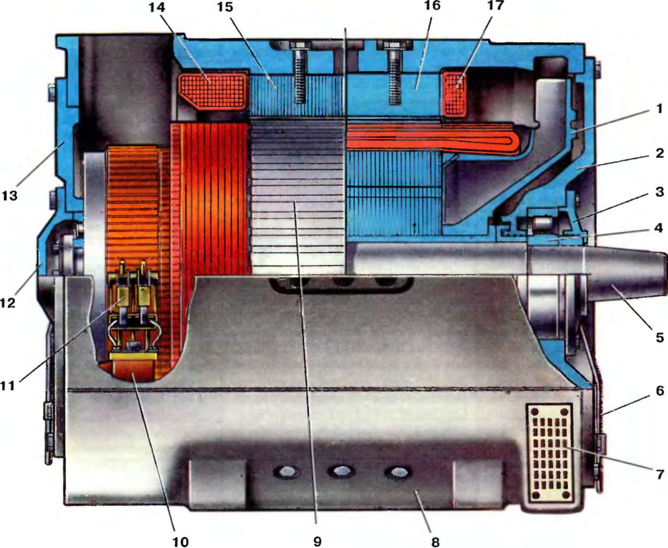 1 - вентилятор: 2 - задний подшипниковый щит; 3 - задняя крышка подшипника; 4 - подшипник; 5 - вал якоря; 6 - трубка смазки подшипника; 7 - вентиляционная решетка; 8 - остов (станина); 9 - якорь; 10 - кронштейн щеткодержателя; 11 - щеткодержатель; 12 - передняя крышка подшипника; 13 - передний подшипниковый щит; 14 - катушка главного полюса; 15 - сердечник главного полюса; 16 - сердечник дополнительного полюса; 17 - катушка дополнительного полюса
