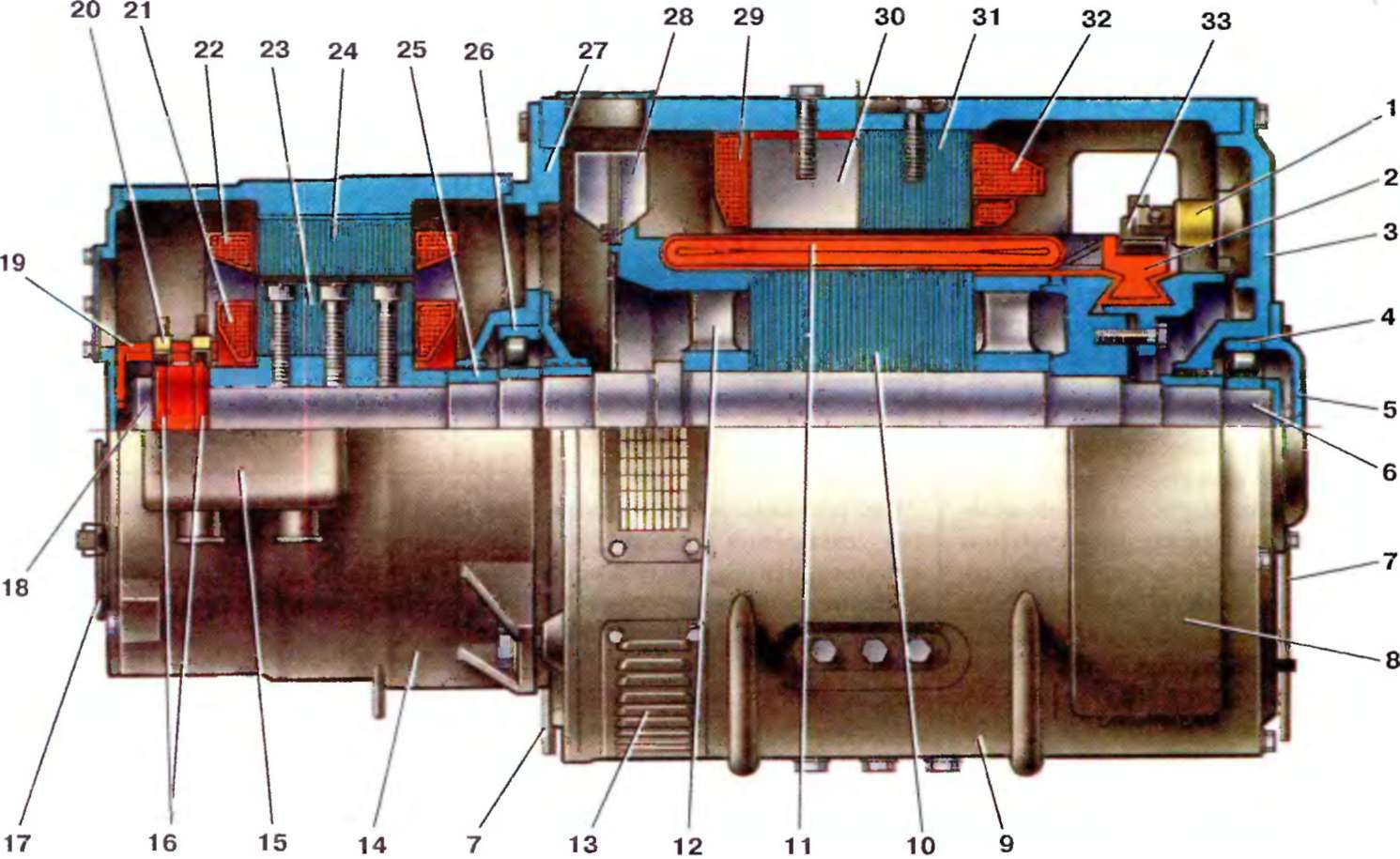 1 - траверса щеткодержателя двигателя; 2 - коллектор двигателя: 3 - щит двигателя: 4, 26 - подшипник; 5 - крышка подшипника; 6 - вал; 7 - трубка смазки подшипника; 8, 17 - крышки смотровых люков; 9 - остов двигателя; 10 - якорь двшателя; 11 - обмотка якоря; 12 - обмоткодержатель; 13 - вентиляционные отверстия; 14 - станина генератора; 15 - коробка выводов; 16 - контактные кольца; 18 - шайба; 19 - траверса щеткодержателя генератора; 20 - щеткодержатель генератора; 21 - обмотка ротора; 22 - обмотка статора; 23 - ротор генератора; 24 - статор генератора; 25 - втулка; 27 - подшипниковый шит; 28 - вентилятор; 29 - обмотка дополнительного полюса; 30 - дополнительный полюс двигателя; 31 - главный полюс двигателя; 32 - обмотка главного полюса; 33 - щеткодержатель