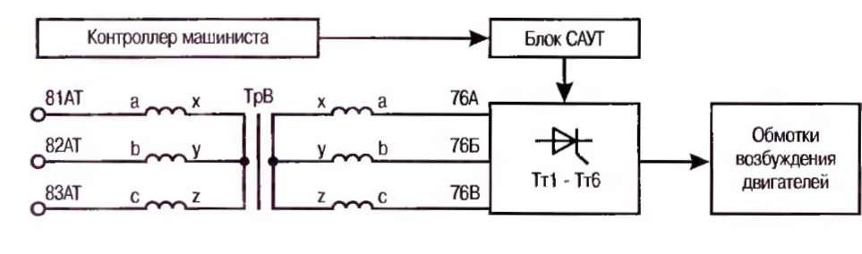питаются током от синхронного генератора через контактор возбуждения КВ по проводам 81, 82, 83 (рис. 3.8). К вторичным обмоткам через тиристор-ный преобразователь (управляемый выпрямительный мост) Тт1-Тт6 подсоединяются обмотки возбуждения тяговых двигателей в режиме электрического торможения с независимым возбуждением. Поскольку эти обмотки входят в высоковольтную схему, а цепи генератора управления относятся к низковольтным цепям, трансформатор ТрВ обеспечивает гальваническую развязку цепей. Он понижает напряжение, которое подается на тиристорный мост Тт1-Тт6. Тиристорами управляет блок САУТ по команде контроллера машиниста.