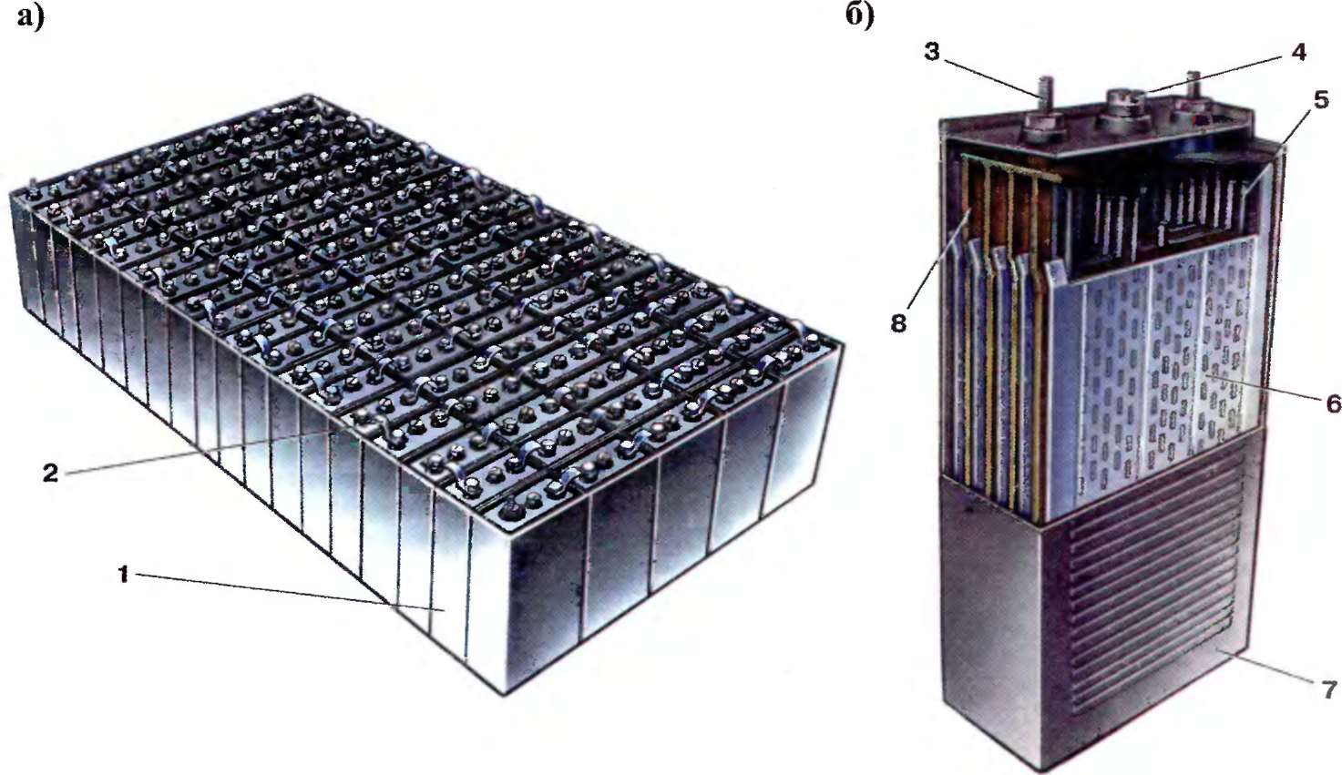 а - общий вид батареи; б - аккумуляторный элемент (банки): 1 - аккумуляторный элемент (банка); 2 - межэлементное соединение; 3 - выводы пластин; 4 - пробка; 5 - изолирующий стержень; 6 - сепаратор; 7 - корпус; 8 - пласіины