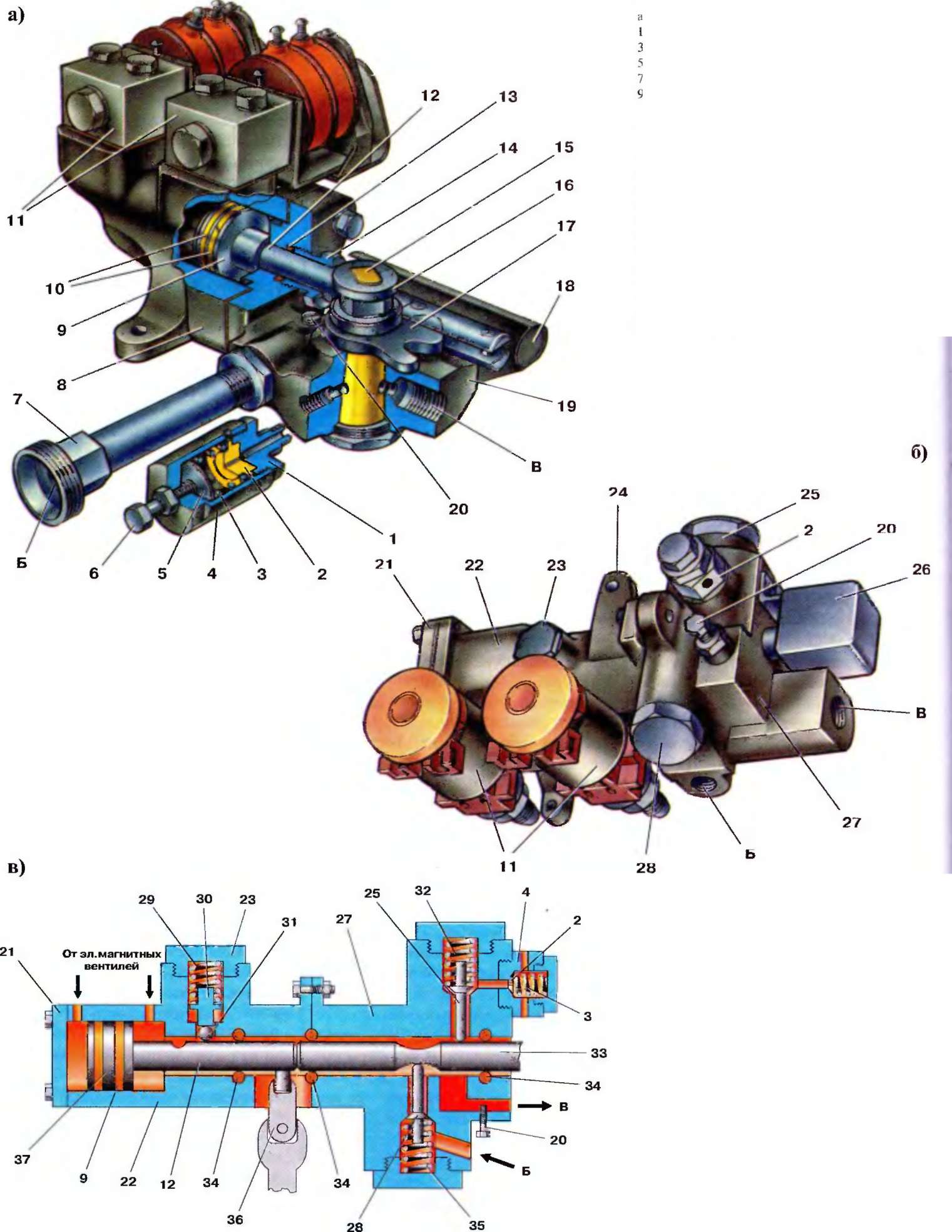 - включающие вентили; 12 - шток; 13 - уплотни-тельная набивка; 14 - уплотнитсльная гайка штока: 15 - золотниковая пробка; 16 - головка золотниковой пробки; 17 - звезда; 18 - защитный кожух; 19, 27 -клапанная коробка; 20 - винт дросселирующего устройства; 21 - крышка; 22 - цилиндр пневмопривода; 23 - пробка фиксатора; 24 - кронштейн рычага ручного переключения; 25 - клапан; 26 - концевой выключатель; 28 - включающий клапан; 29 - пружина фиксатора; 30 - толкатель; 31 - шарик; 32 - пружина клапана; 33 - стержень клапанной коробки; 34 - уплотнитель; 35 - пружина включающего клапана; 36 - рычаг ручного переключения; 37 - манжета поршня; Б - отверстие подвода сжатого воздуха; В - вывод к пне вмопилиндру
