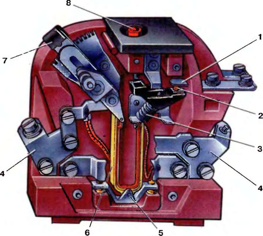 1 - неподвижный вспомогательный контакт; 2 - подвижный вспомогательный контакт; 3 - пружина; 4 - главный контакт; 5 - ось; 6 - биметаллическая пластина; 7 - ручка регулировки уставки реле; 8 - кнопка возврата реле