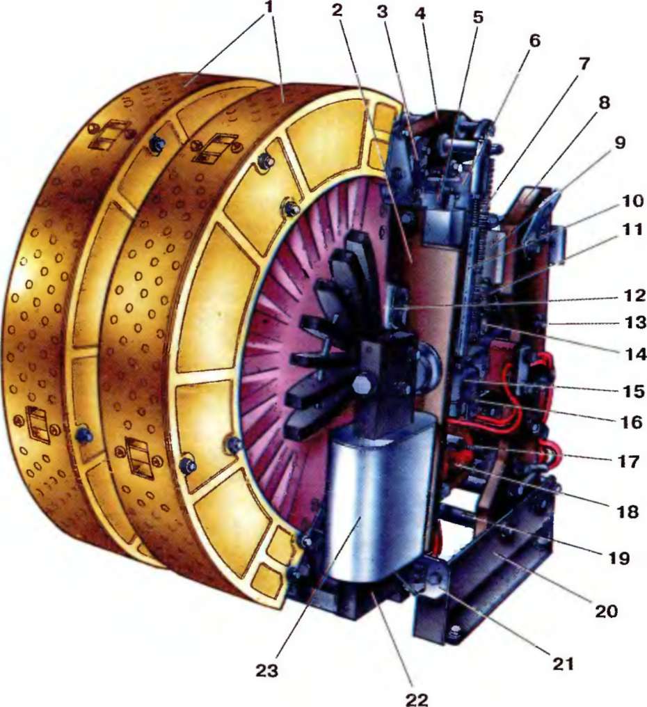 1 - дугогасительные камеры; 2 - изоляционная панель; 3 - кронштейн; 4 - тяга; 5, 6 - цилиндры пневмопривода; 7 - отключающая пружина; 8 - изоляционная боковина; 9 - кронштейн рамы; 10 - стержень: 11 - пружина якоря; 12 - контактный рычаг; 13 - ось; 14 - якорь; 15 - магнитопровод; 1 б - шунт; 17 - винт регулировки тока уставки; 18 - удерживающая катушка; 19 - распорка рамы; 20 - уголок; 21 - пластина; 22 - магнитопровод дугогасителыюй системы; 23 - дугогасительная катушка