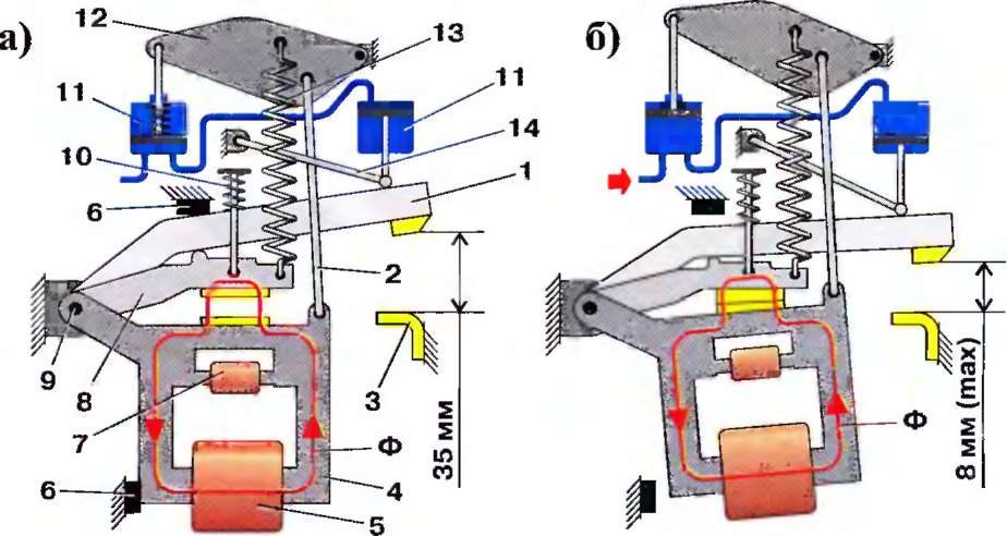 и сжатый воздух поступает в цилиндры 11 и 14 пневмопривода. Поршень цилиндра 11 поднимается и поворачивает тягу 12 по часовой стрелке, растягивая тем самым отключающие пружины 13. Поскольку стержни 2 вместе с тягой 12 также перемещаются вверх, магнитопровод 4 начинает поворачиваться вокруг оси 9 против часовой стрелки.