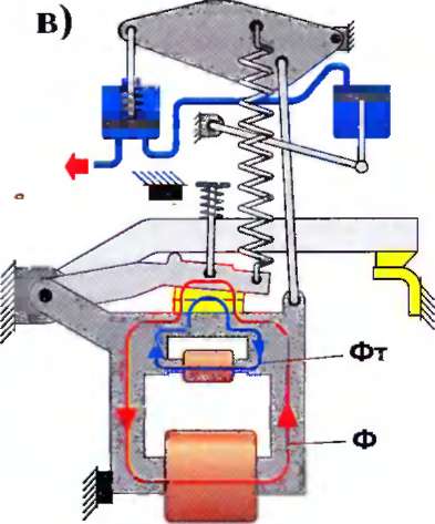 Одновременно поршень цилиндра 14 под действием сжатого воздуха перемещается вниз и толкателем 15 воздействует на контактный рычаг 1 с якорем 8, поворачивая их по часовой стрелке до прижатия якоря 8 к полюсам электромагнита. При этом между главными контактами остается зазор, так как дальнейший ход контактного рычага 1 ограничивает повернутый ему навстречу магнитопровод 4. Магнитный поток удерживающей катушки Ф теперь замыкается через прижатый якорь, усиливается и прочно удерживает якорь.