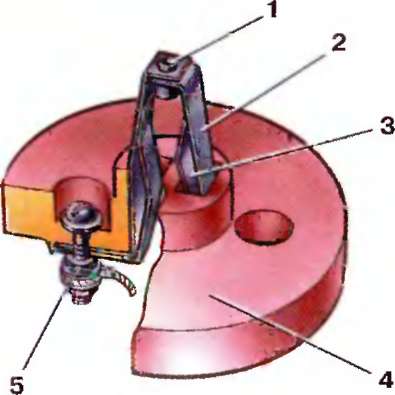 I - плавкий контакт; 2 - контактная пластина; 3 - листовая пружина; 4 - основание; 5 - контактный зажим