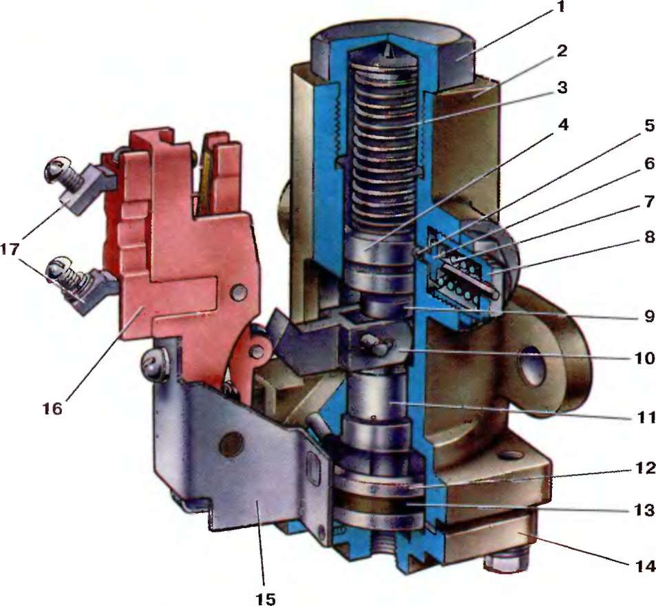I - пробка; 2 - корпус; 3 - отключающая пружина; 4 - направляющая гильза; 5 - шарик; 6 - толкатель; 7 - регулировочная пружина: 8 - регулировочный стакан: 9 - шток: 10 - рычаг; 11 - направляющая втулка; 12 - поршень; 13 - манжета; 14 - крышка; 15 - кронштейн; 16 - электроблокировка (кулачковый контактор); 17 - клеммы