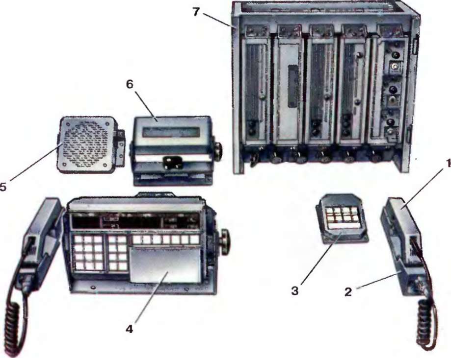 1 - трубка: 2 - кронштейн грубки; 3 - резервный пульт управления радиостанцией; 4 - основной пульт управления радиостанцией; 5 - громкоговоритель: 6 - блок индикации: 7 - блок управления
