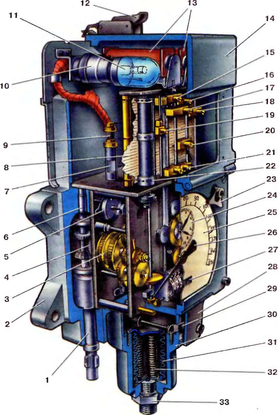 1 - приводной валик; 2 - корпус; 3 - часовой механизм: 4 - реверсивное устройство; 5 - баланс часового механизма; 6 - валик реверсивного устройства; 7 - фрикционный механизм приемной катушки регистрирующего устройства; 8 - регистрационная лента; 9 - прижимное устройство фрикционного механизма приемной катушки: 10 - патрон лампы подсветки регистрирующего устройства; 11 - лампа подсветки регистрирующего устройства: 12 - замок крышки скоростемера; 13 - электромагниты регистрирующего устройства; 14 - кожух регистрирующего устройства; 15 - пишущий узел регистрации времени; 16 - пишущий узел регистрации красного огня; 17 - пишущий узел регистрации желто-красного огня; 18 - пишущий узел регистрации включения ЭПК и контроля бдительности машиниста; 19 - пишущий узел регистрации включения желтого огня; 20 - пишущий узел регистрации давления в тормозном цилиндре; 21 - пишущий узел регистрации скорости: 22 - лентопротяжный барабан; 23 - ключ завода часов: 24 - циферблат часов; 25 - шкала скоростемера; 26 - стрелка указателя скорости: 27 - счетный механизм пробега; 28 - крышка индикатора тормозного давления; 29 - рычаг привода пишущего узла регистрации давления в тормозном цилиндре; 30 - корпус индикатора тормозного давления; 31 - сильфон индикатора тормозного давления: 32 - пружина сильфона; 33 - штуцер подвода воздуха из тормозного цилиндра