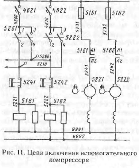Во 2-м положении выключателя катушка контактора 5181 включения двигателя вспомогательного компрессора получает питание по следующей цепи (рис. 11): провод 5000, АЗВ 4621, провод 4600, контакты / — 2 выключателя 5281, замкнутые во 2-м и 4-м положениях, провод 5210, контакты реле давления 5241, провод 5221, катушка контактора 5181, провод 9991.