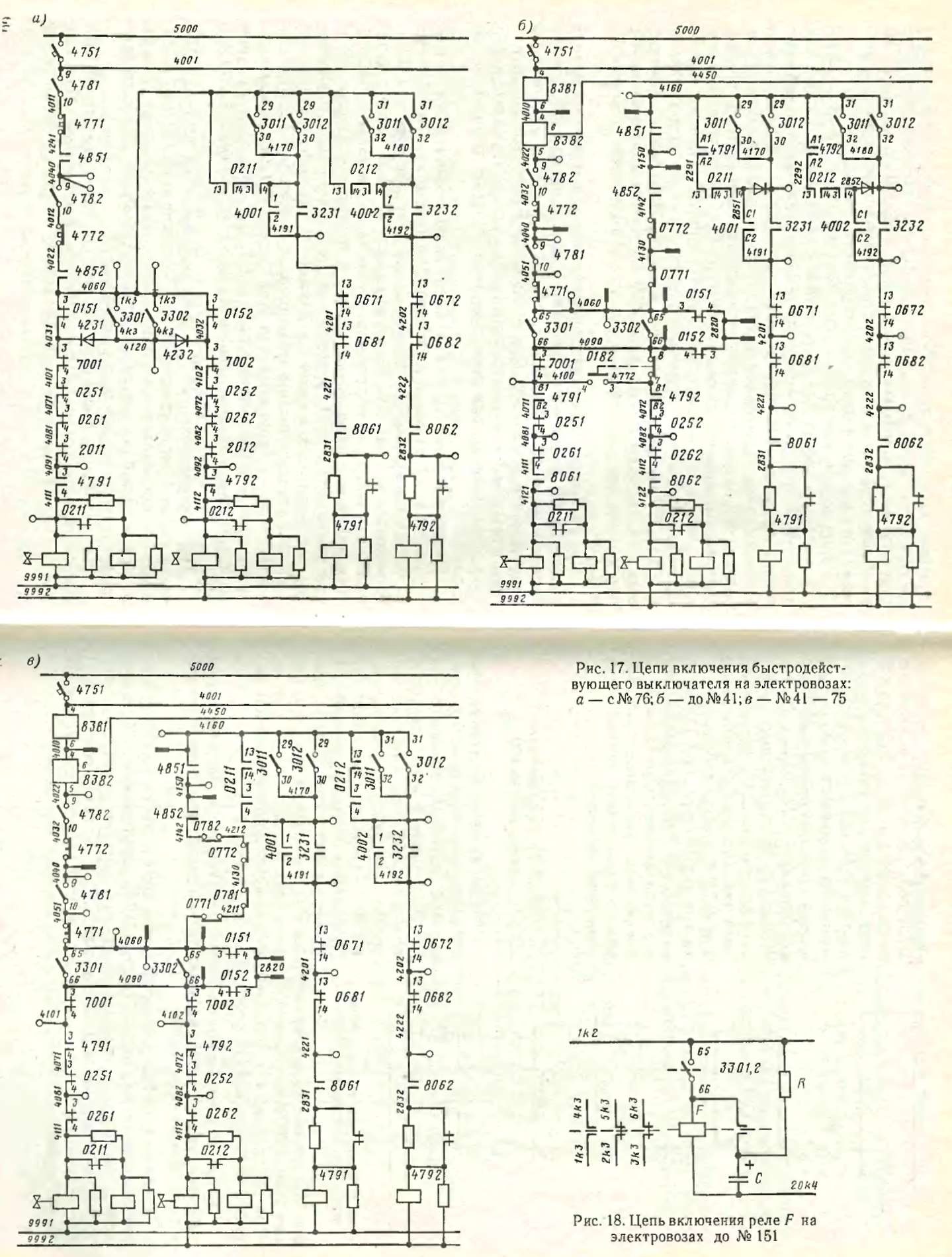 На электровозах до № 76 в цепи включения БВ 021 (рис. 17, в) отсутствуют блок-контакты ДР 201, блок-контакты ДР 0151 и 0152 включены последовательно; в цепи включения контактора 479 и БВ 021 находятся блок-контакты разъединителей 077, 078 и введены блок-контакты устройств диагностики 838.
