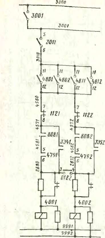 После включения контактора 479 образуется цепь (рис. 19): провод 5000, АЗВ 3001, контакты 5 — 6 ВУ ЗОИ, провод ЗОЮ, контакты // — 12 выключателя 480 или 481, провод 4560, обратные блок-кон-Рис, 19. Цепь включения контакта- такты 7 — 8 реле напряжения 112 ров400на электровозах с№41 (размыкаются при напряжении в