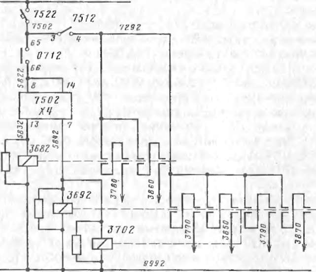 После включения реле 3491 его блок-контакты замыкают цепи питания следующих аппаратов: \