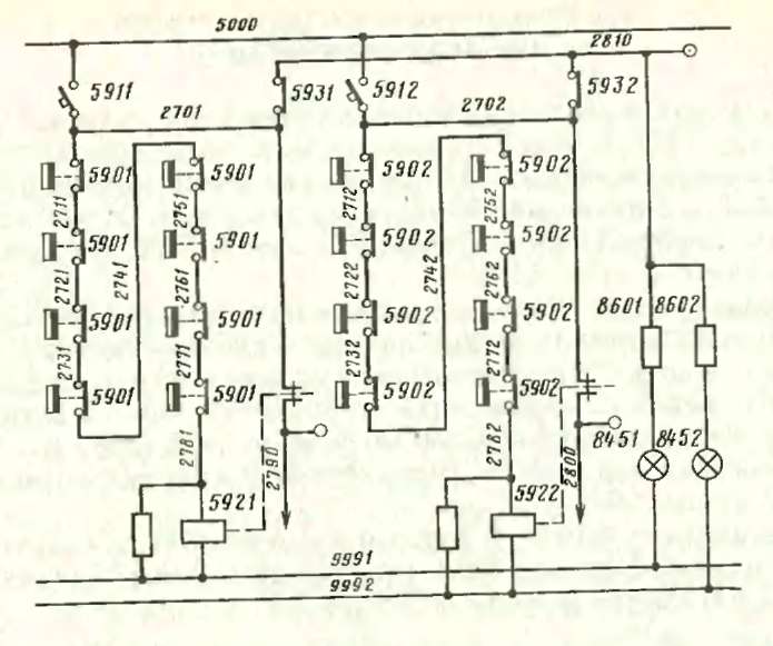При повышении температуры подшипника редуктора ТД расплавляется плавкая вставка предохранителя590, и реле592отключается. При замыкании обратных блок-контактов реле 592 получает питание сигнальная лампа а4 на панели<?27((523)по цепи: обратные блок-контакты реле 592, провод 2790 (2800), зажим а4 сигнальной лампы (см. рис. 39).