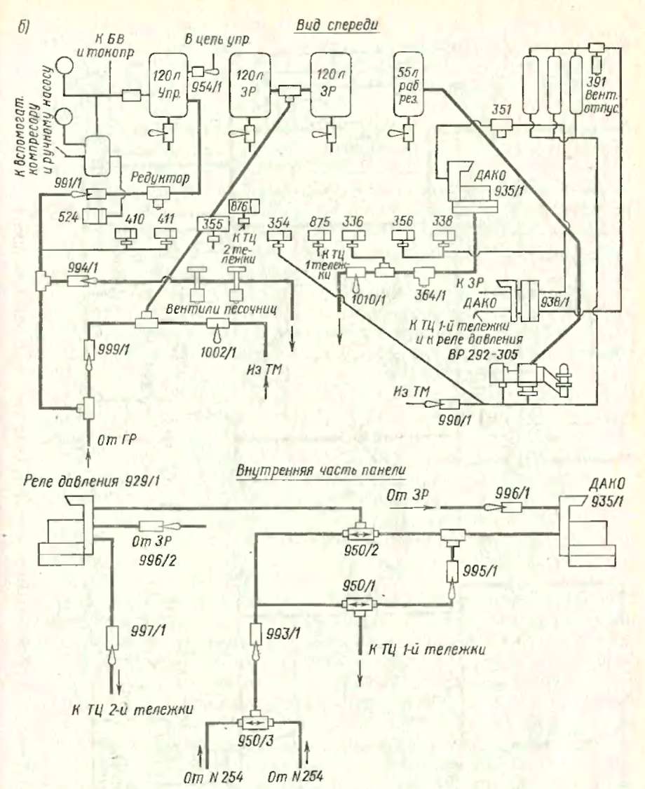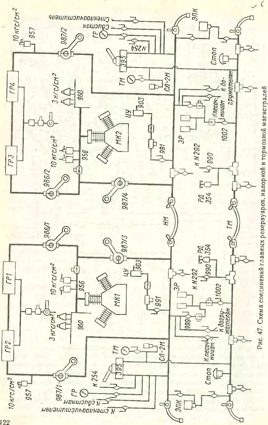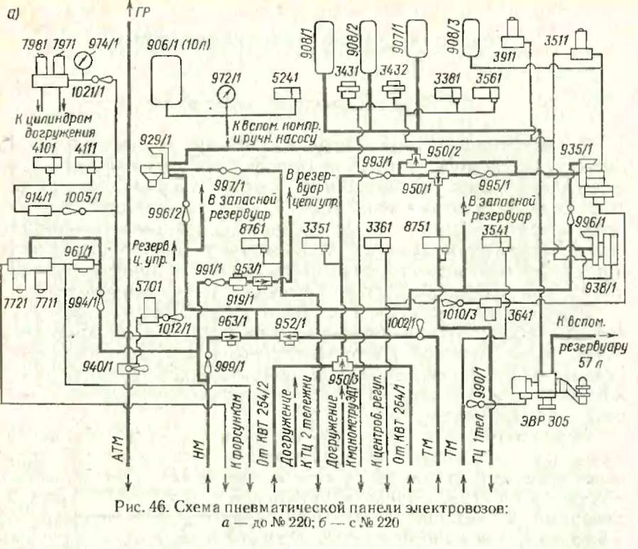 Пользоваться большой и сложной пневматической схемой не всегда удобно, поэтому, кроме нее, в настоящей главе приведены схемы пневматической панели электровозов (рис. 46) и соединений главных резервуаров, напорной и тормозной магистралей (рис. 47), которые помогут машинисту быстрее отыскать нужный пневматический аппарат или кран.