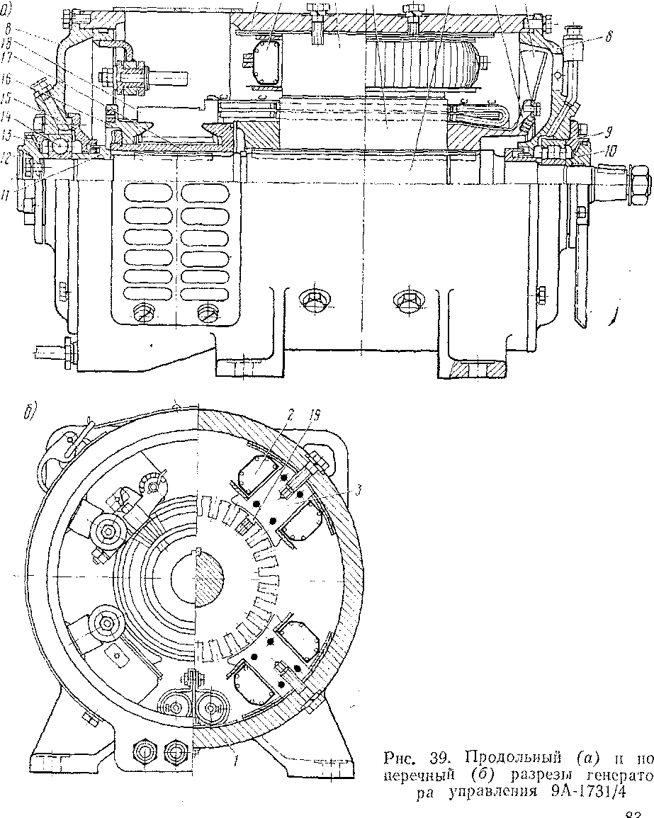 Остов / (рис. 39) генератора цилиндрической формы изготовлен из электротехнической стали с высокими магнитными свойствами. В нижней части остова имеются четыре лапы, предназначенные для крепления к кожуху мотор-вентилятора. Два прямоугольных люка в остове, закрытые крышками, служат для осмотра коллектора.