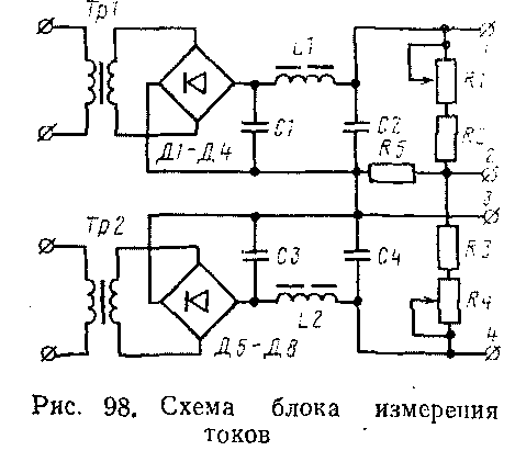 Каждый блок Б1185в имеет по два трансформатора тока Тр1, Тр2 (рис. 98), первичная обмотка каждого из которых включена последовательно в цепь рабочих обмоток соответствующего ТПТ, т. е. один блок обрабатывает сигналы от двух ТПТ. Ко вторичной обмотке трансформатора Тр1 (Тр2) через выпрямительный мост Д1—Д4, Д5—Д8 и сглаживающее устройство — 1С-фильтр подключен Делитель напряжения, состоящий из резисторов Я1, Я2, Я5 (ЯЗ, Р\4, Р5). На выходе 1—2 (3—4) напряжение постоянного тока пропорционально току в цепи рабочих обмоток ТПТ, т. е. силовому току в цепи тягового двигателя. Как видно из рис. 98, резистор ,Я5 включен в оба делителя напряжения. Через него протекает сумма вторичных токов, вследствие чего напряжение на резисторе Я5 пропорционально сумме токов якорей двух тяговых двигателей. С помощью регулируемых резисторов К1 и Я4 осуществляется точная настройка системы измерения токов-