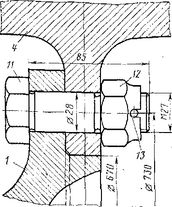 Зубчатое колесо 4 (рис- 106) плотно насаживают на конический прилив колесного центра / >и дополнительно крепят 12 призовны-ми болтами Л диаметром 28 мм с корончатыми гайками 12 и шплинтами 13.