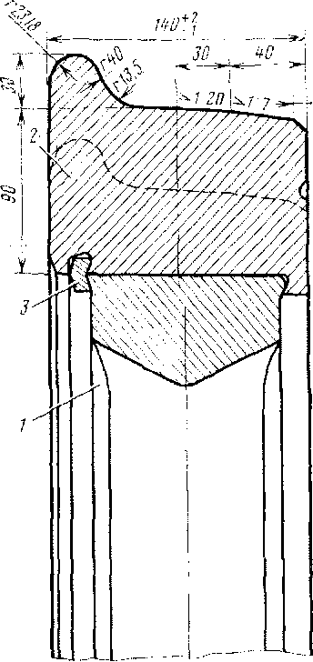 Чтобы предохранить бандаж от оползания с колесного центра, которое возможно при недостаточно тугой посадке или продолжительном тор-можении и нагреве колодками, дополнительно крепят бандаж 2 (рис. 107) на ободе колесного центра 1. С внешней стороны колесной лары бандаж имеет бурт, предохраняющий его от сдвига внутрь колесной пары, с внутренней — выточку или канавку. В канавку (выточку) - закладывают кольца 3, после чего бурт бандажа обжимают. Поверхность бандажа по кругу катания обтачивают по установленному профилю.