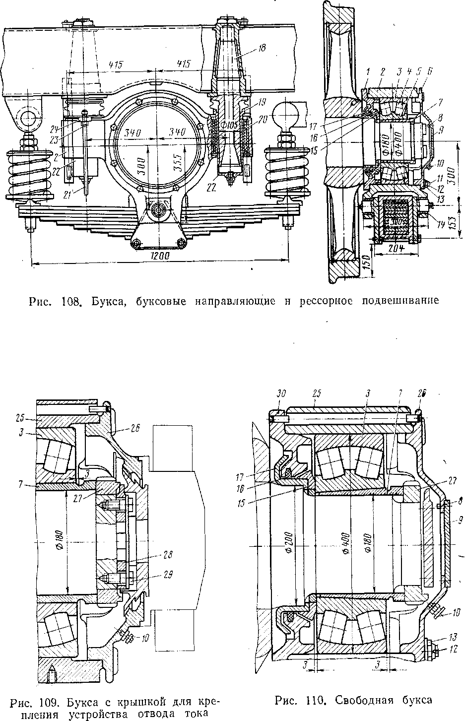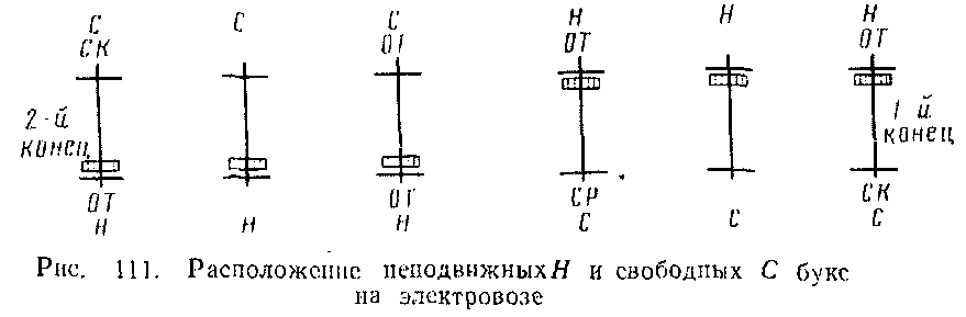 . На электровозе применяют два типа букс: неподвижные Н (см-рис.108) и свободные С (см. рис. 110). Неподвижные находятся со стороны зубчатой передачи, свободные — с противоположной стороны. У свободных букс в отличие_от неподвижных между наружным кольцом 3 подшипника и наружной 26 и внутренней 30 крышками имеются зазоры по 3 мм, позволяющие корпусу буксы 25 перемещаться относительно подшипника. Свободные буксы компенсируют монтажные неточности при изготовлении и сборке буксовых узлов и предупреждают заедание подшипников при температурных удлинениях оси.