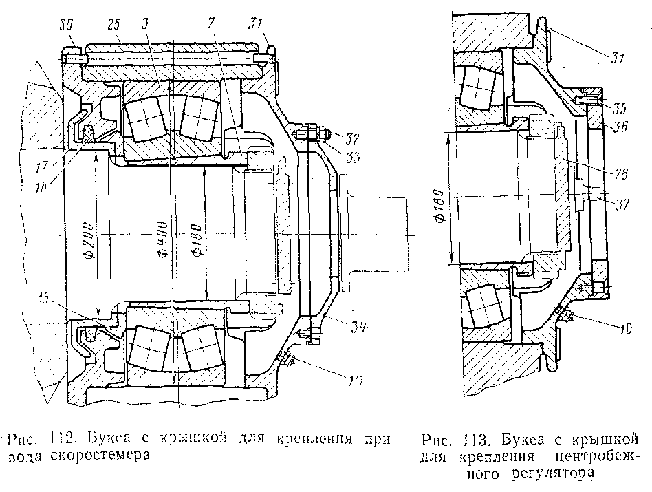 На буксах с обозначениями ОТ (см. рис. 111) установлено устройство для отвода тока, с обозначениями СК — привод к скоростемеру (см. рис. 112) и СР — скоростной регулятор. У букс, имеющих устройство для отвода тока (см. рис. 109), несколько изменена конструкция наружной крышки. На крышке 31 свободной буксы укреплена шпильками 32 и гайками 33 промежуточная крышка 34 с приводом к электрическому скоростемеру. К крышке буксы, на которой установлен центробежный регулятор (см. рис. 113), прикреплена винтами 35 плоская шайба 36. Для приведения в действие регулятора на фиксирующей планке 28 укреплен специальный поводок 37.