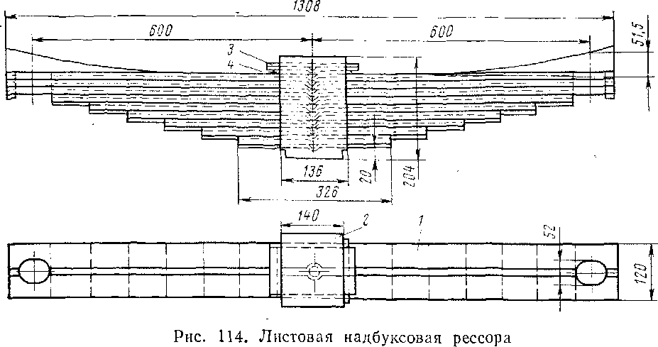 Листовые рессоры. Рессоры первичного подвешивания собраны из постепенно укорачивающихся наложенных друг на друга закаленных стальных листов 1 (рис. 114), связанных в одно целое хомутом 2, который надевают на них в горячем состоянии и опрессовывают. Верхние листы длиной 1308 мм называются