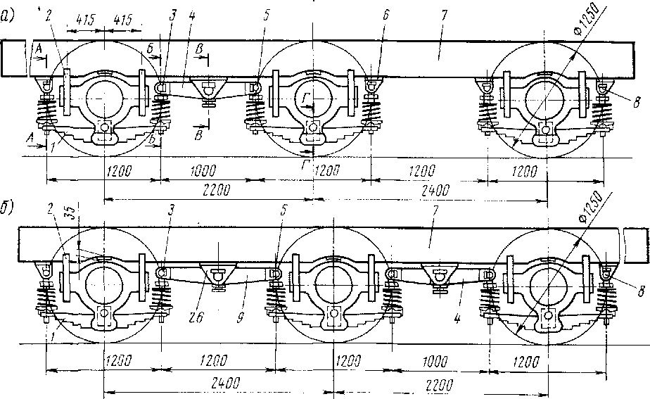 Передача вертикальной нагрузки от рамы тележки на буксы колесных пар осуществляется цилиндрическими пружинами, балансирами, листовыми рессорами и соединяющими их деталями (рис. 116 и 117).